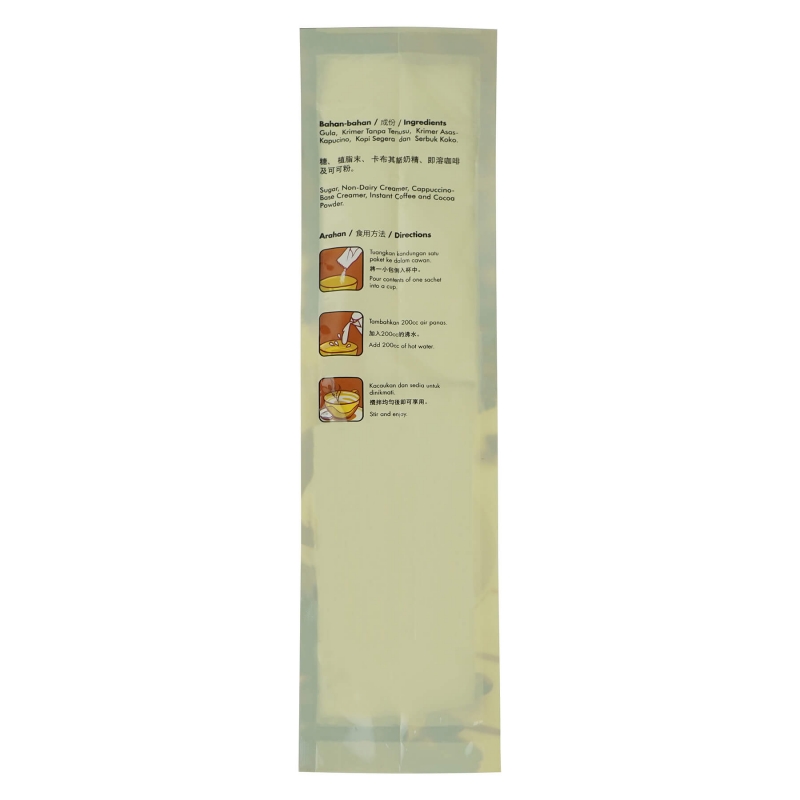 成份:糖、植脂末 [ 葡萄糖漿、完全氫化植物脂肪(棕櫚油)、穩定劑(磷酸氫二鉀E340(ii)、三聚磷酸鈉E451(i))、酪蛋白酸鈉(牛奶衍生物)、乳化劑(脂肪酸一甘油酯和脂肪酸二甘油酯E471、二乙酰酒石酸甘油酯和脂肪酸甘油酯E472e)、抗結塊劑 (二氧化矽E551) ]、起泡奶精 [ 葡萄糖漿(玉米、木薯粉或小麥)、完全氫化植物脂肪(椰子油)、乳固體(脫脂奶粉)、穩定劑(磷酸氫二鉀E340(ii))、乳清蛋白粉(牛奶)、乳化劑(乳酰化硬脂酸鈉E481(i))、酪蛋白酸鈉(牛奶衍生物)和調味料 ]、即溶咖啡粉、麥芽糊精、鹼化可可粉。 此產品含有奶類及奶類製品。